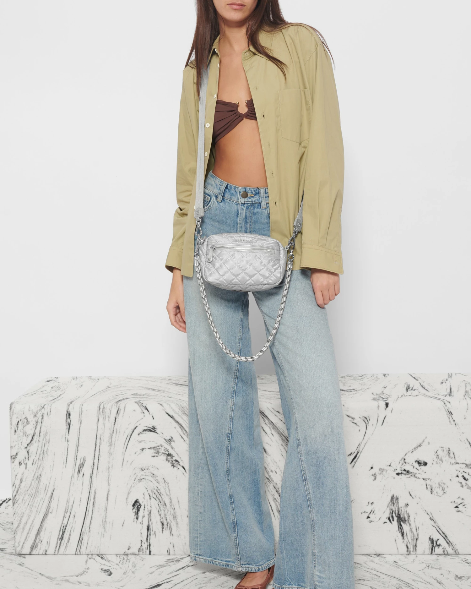 We updated the Mini Crosby, now with a single zip top opening, perfectly proportioned for quick day trips and breezy summer evenings. Made from REC nylon, it has two exterior pockets and include a detachable, adjustable crossbody strap and a detachable handwoven Italian Leather strap.
